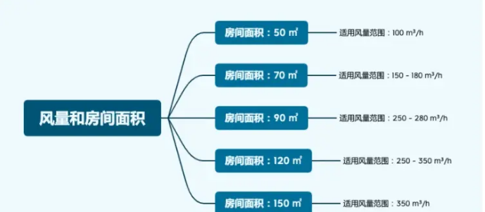 一般臥室按 50 平米以內來算的話,得要至少 100 風量的機子,150 - 180 風量大概可以覆蓋 70 平米以內的面積,以此類推,具體標準可以參考這個圖。