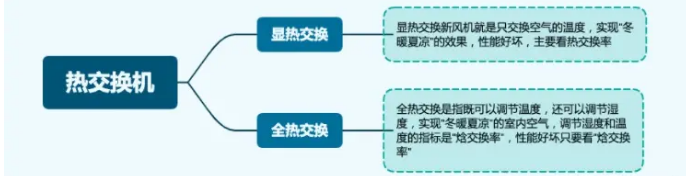 熱交換器也分為溫度和濕度調節,如果是只進行溫度交換的叫顯熱交換,把溫度和濕度都調節的叫全熱交換,顯然,全熱交換更舒適也更加節能,比顯熱交換領先,目前市面上主流的都是全熱交換的產品了。