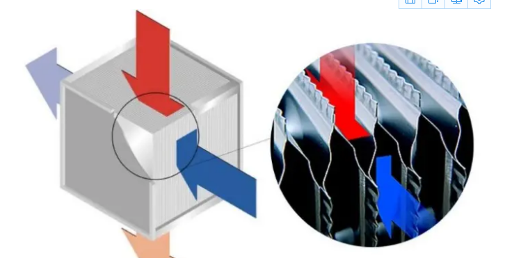 市面上應用最多的換熱器是“間壁式換熱器”,熱交換器由一層層的平行芯片構成,這些特殊的芯片流動著冷熱兩種氣流,冷的外界空氣進入室內,而熱的室內空氣會排出去,這兩股氣體相遇后,完成熱量交換,但并沒有混合。